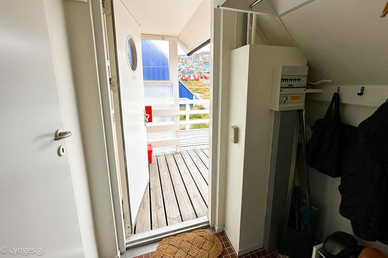 Velindrettet enderækkehus beliggende på Århusvej 1 i Qaqortoq. Boligen er et 2-rums hus med en rigtig god og ugeneret udsigt over Qaqortoq samt mod bugten mod syd, hvilket giver optimale lysforhold og smukke udsigter året rundt.