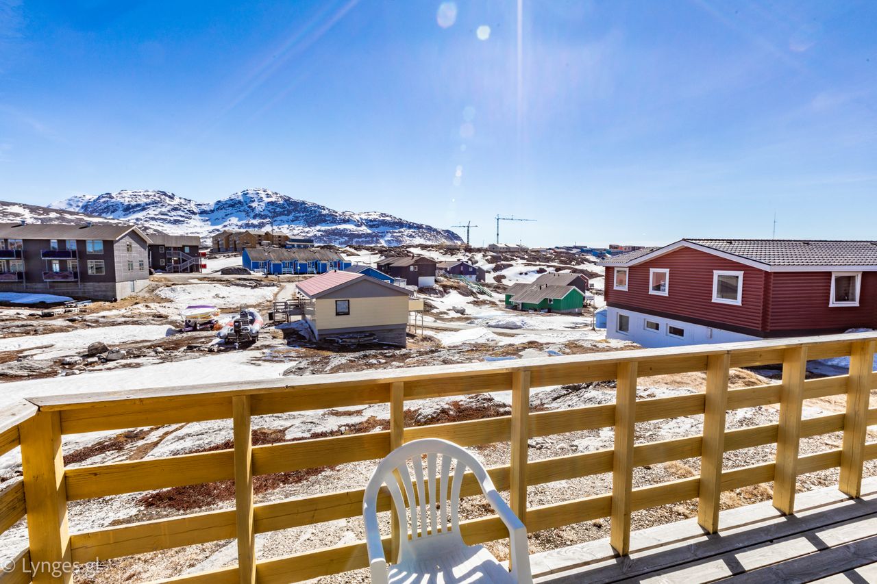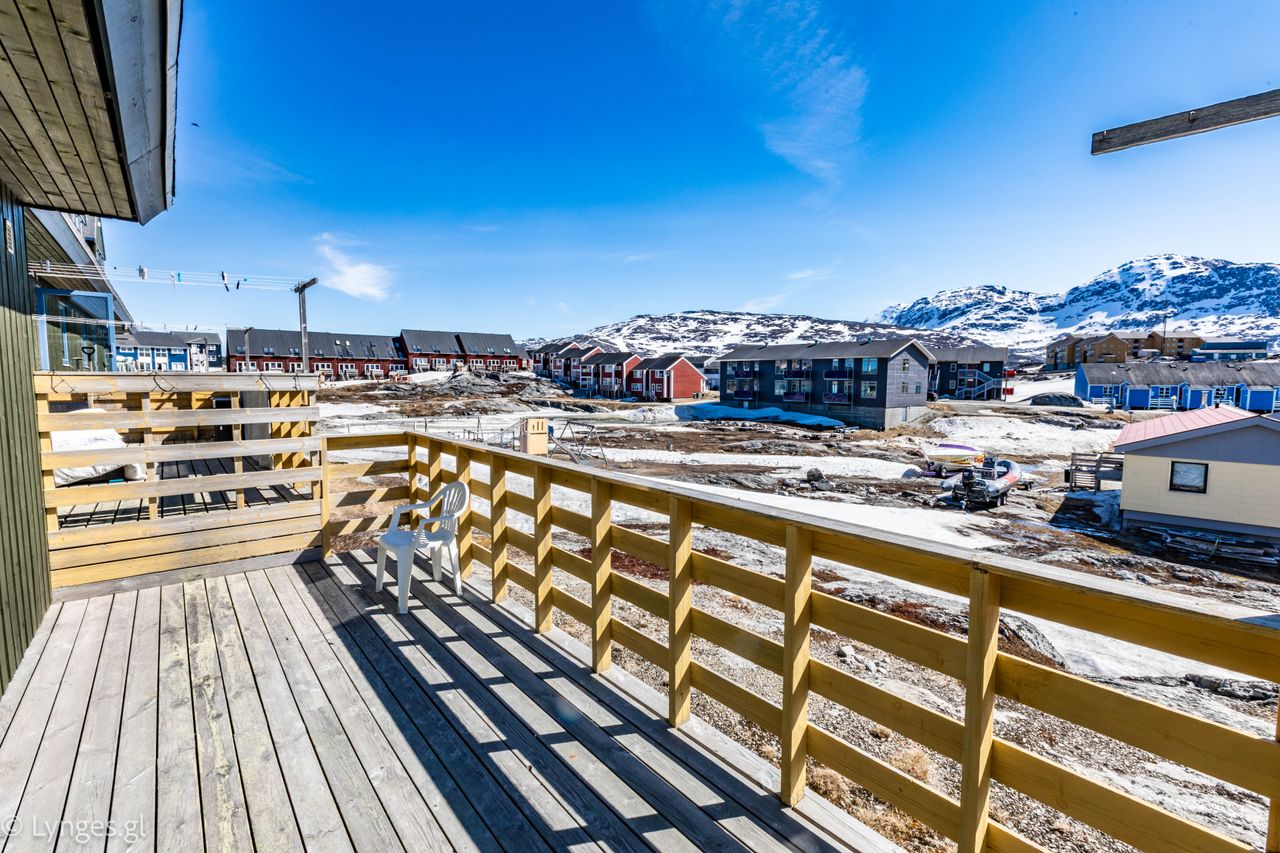 Boligen rummer tre gode soveværelser og et stort, lyst køkken-alrum, hvor der er rigeligt med plads til både madlavning, samvær og hverdagsliv. Fra alrummet er der udgang til en østvendt terrasse med skøn udsigt over det smukke naturområde Eqalugalinnguit, hvor du kan nyde morgensolen, udsigten til en hyggelig sø, grønne omgivelser og trygge legepladser – et sandt paradis for børnefamilier.