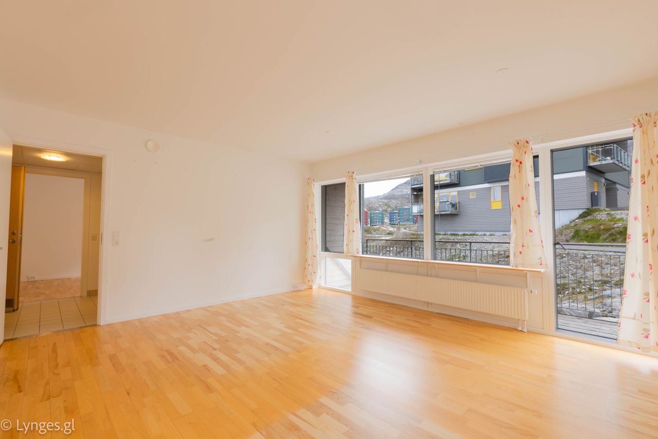 Meget velholdt 2 rums ejerlejlighed for enden af in lukket vej. Altan med udsigt over Store Malene og bugten ved Qinngorput. Dejligt lysindfald i lejligheden. Flotte Junkers parketgulve i hele lejligheden. Aflåst indgangsparti med dørtelefon og egen depotrum. Elevator. Fælles parkering.