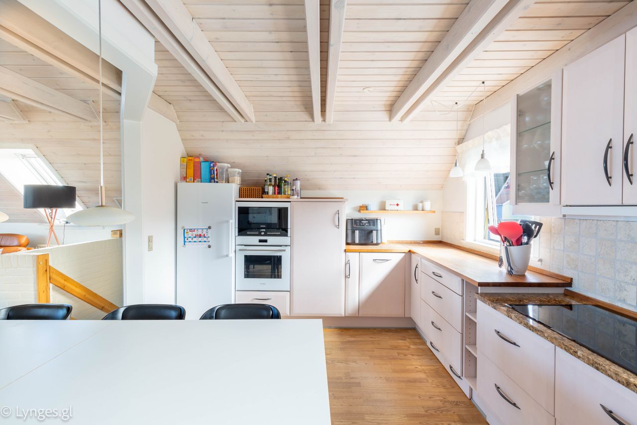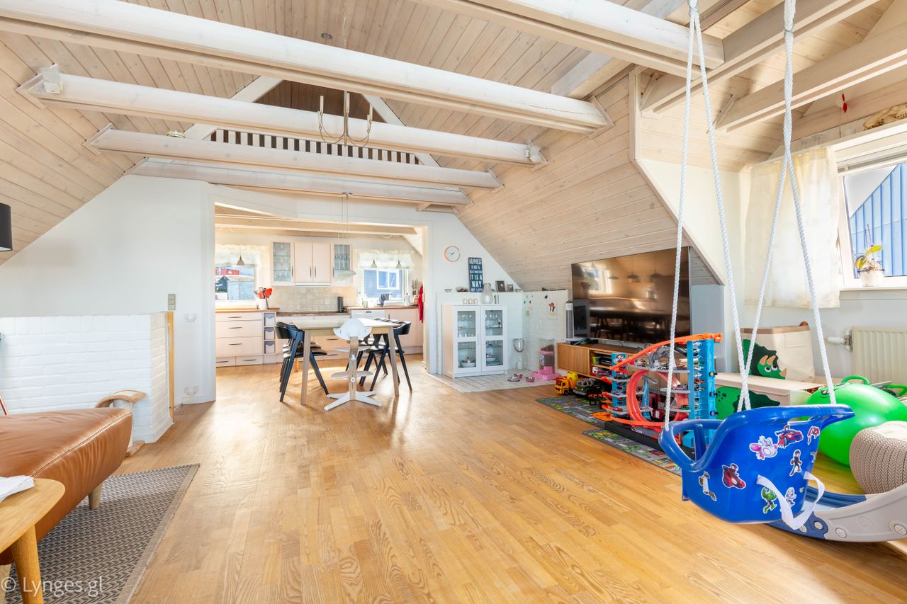 Planløsningen er velgennemtænkt med en naturlig opdeling mellem opholdsrum og private rum, hvilket gør boligen både behagelig og praktisk i hverdagen.