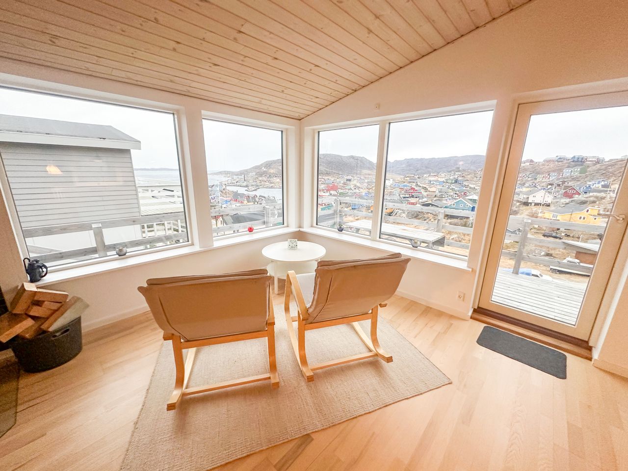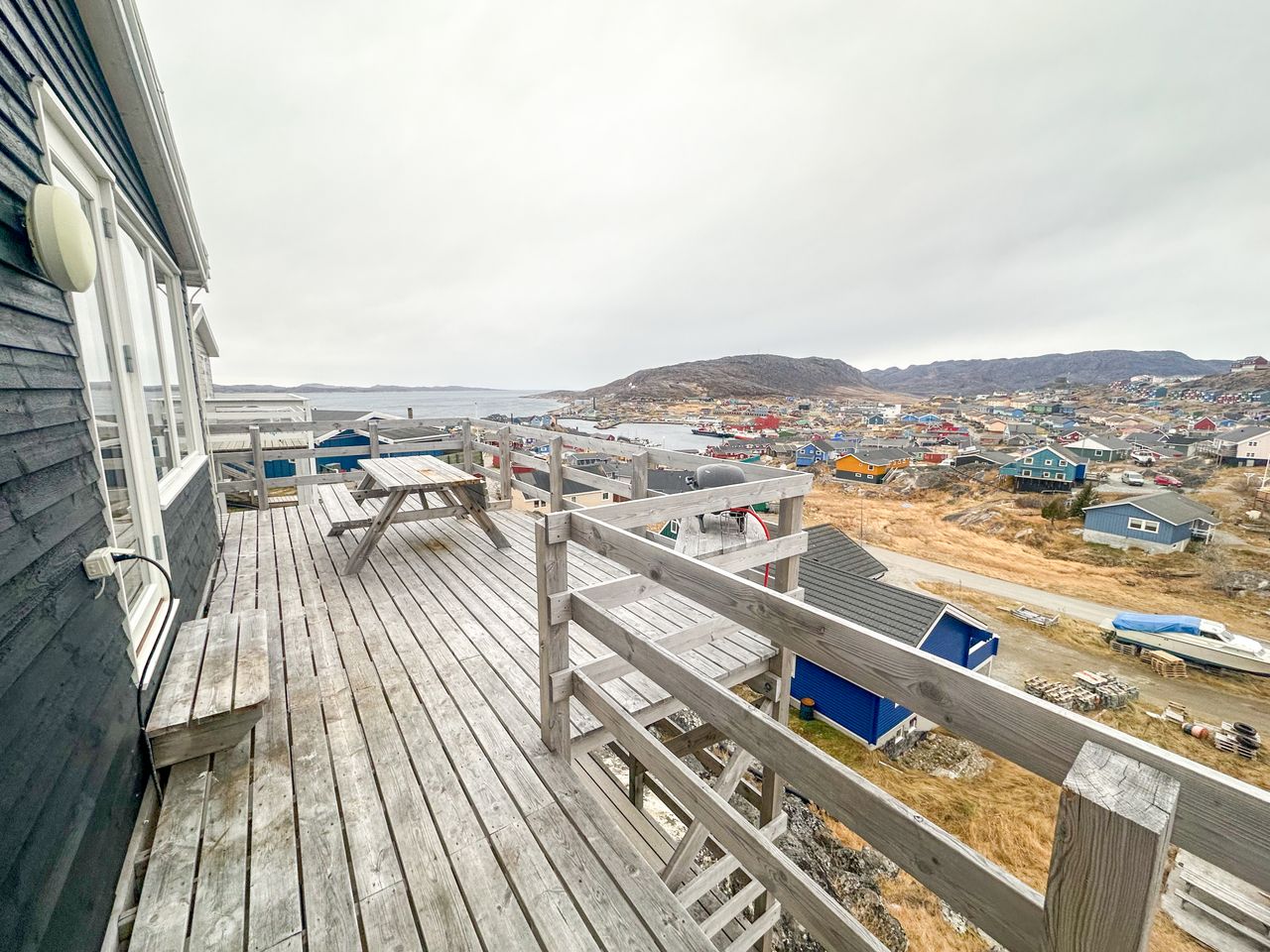 Fra både stue og terrasse får du en fantastisk udsigt over Qaqortoq, havneområdet og havet. Her kan du følge livet i byen, sejlladsen på fjorden og skiftende vejr, der gør udsigten til et levende maleri.