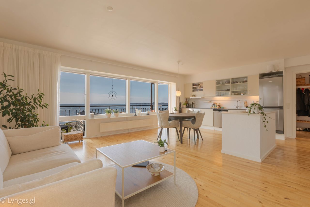 Indretning: Fin entré med parketgulv og garderobeplads. Lyst værelse med sydvendt havudsigt, parketgulve og skabsplads. Køkken og stue i åben forbindelse med parketgulve og fremragende udsigt og lysindfald. Køkkenet er fra HTH og er med hvide elementer og dertilhørende hårde hvidevarer, udgang til en skøn sydvendt altan, der lægger i læ for nordenvinden og har masser af sol, på solrige dage. Mellemgang med klinkegulv og gulvvarme, skabsplads samt vaskemaskine og tørretumbler. Badeværelse med klinkegulv og gulvvarme, bruseniche med afskærmning i hærdet glas, toilet samt hvide skabselementer med nedsænket vask. Rummeligt soveværelse med 4 integrerede højskabe.