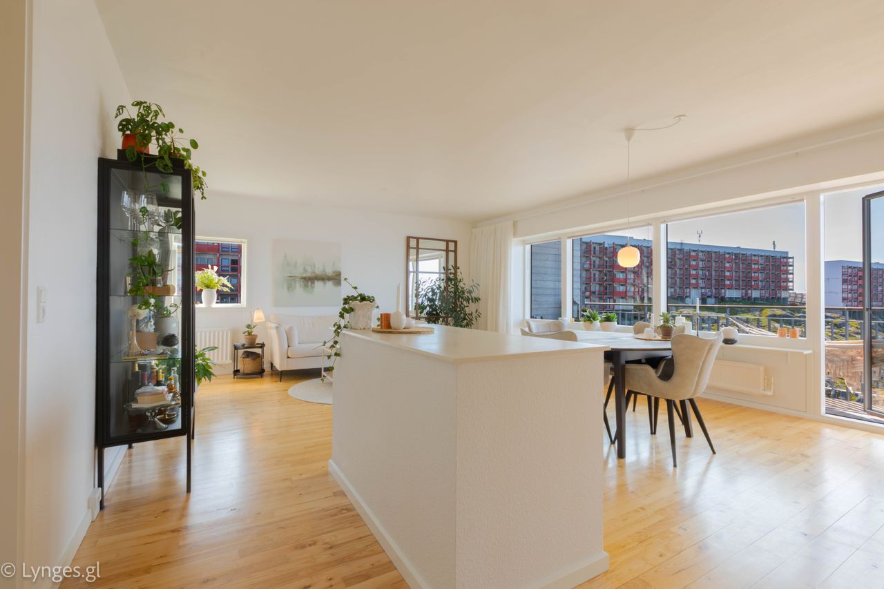 Lækker og meget velholdt 3 rums penthouse ejerlejlighed i det meget attraktive Tuapannguit. Lejligheden er beliggende i det yderste tårn, hvorfor man har en fremragende udsigt mod syd samt til Godthåbsfjorden. Ejerforeningens vedtægter giver tilladelse til at firmaer kan købe ejendom i netop dét tårn. Lejligheden er placeret således, at stuen og altanen vender mod syd og derfor giver en fremragende lysindfald samt læ for nordenvinden, lyden fra vejen er derfor også minimal. Nuuk downtown er ’rundt om hjørnet’, hvor byens mange butikker, cafeer, kulturudbud, barer og restauranter frister. Boligen har parketgulve fra Junckers samt Genvex ventilationsanlæg der giver utrolige lave varmeudgifter.