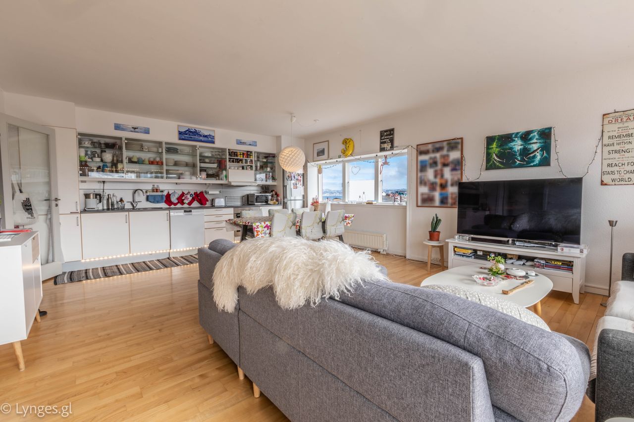 Velkommen til denne skønne og indflytningsklare ejerlejlighed, ideelt beliggende i det attraktive og eftertragtede Tuapannguit-område – en af Nuuks mest populære beliggenheder. Her bor du tilbagetrukket fra byens travle trafik, men med kun få minutters gang til centrum, hvor Nuuk folder sig ud med storcenter, hyggelige caféer, restauranter, specialbutikker, biograf og et væld af sportsfaciliteter.